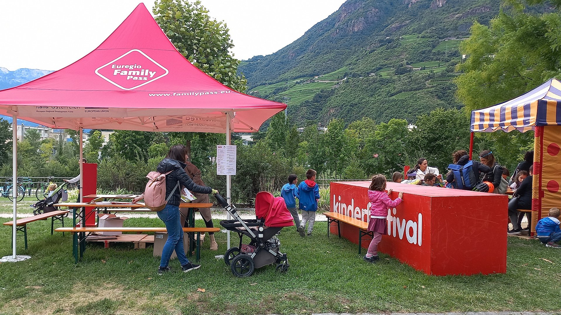 Zahlreiche Familien mit kleinen und größeren Kindern suchten den Stand des EuregioFamilyPasses an der Bozner Wassermauer auf, um sich über die Vorteile des grenzüberschreitenden Familienkarte in Verbindung mit den Partnerbetrieben und die Voraussetzungen zur Mitgliedschaft zu informieren.