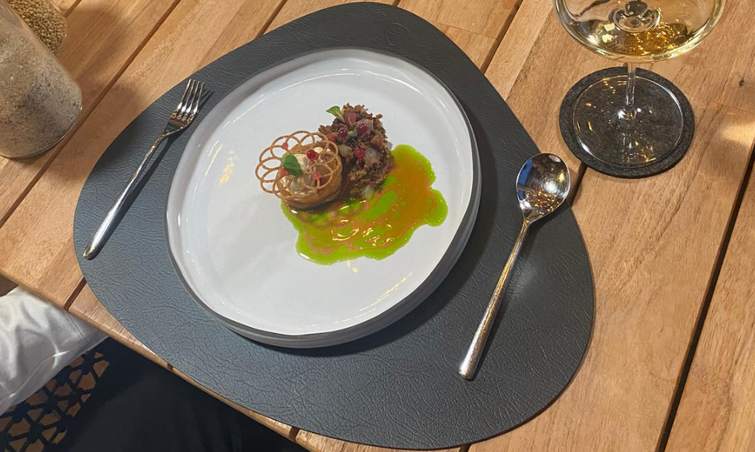 Ein Gericht wie ein Gruß aus der Kindheit: Mit seinem „Schworzplentenen Riebl mit Apfel“ bringt Roland Hanny im Hotel Jagdhof von Latsch ein Stück Vinschgauer Tradition auf den Teller. Der Riebl – aus Buchweizen, Butter und Eiern – wird goldgelb ausgebacken und mit Apfelmus, karamellisierter Apfelrolle und Buchweizenhippe serviert. Dazu ein frischer Apfelsud mit Minzöl. Ein traditionelles Gericht, das durch Raffinesse und Regionalität glänzt.