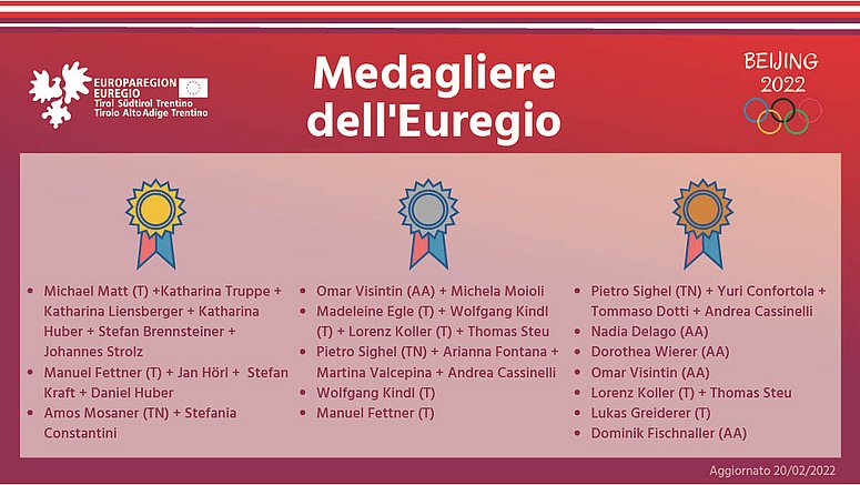 08/02/2022 - Sono cinque le medaglie conquistate fino ad oggi dalle atlete e dagli atleti dell'Euregio Tirolo, Alto Adige e Trentino alle Olimpiadi invernali di Pechino. Oggi l'ultima in ordine di tempo quella d'oro del Trentino Amos Mosaner nel Curling nel doppio misto assieme alla cortinese Stefania Constantini. D’ora in poi vi terremo aggiornati sulle Olimpiadi con il nostro medagliere dell’Euregio!