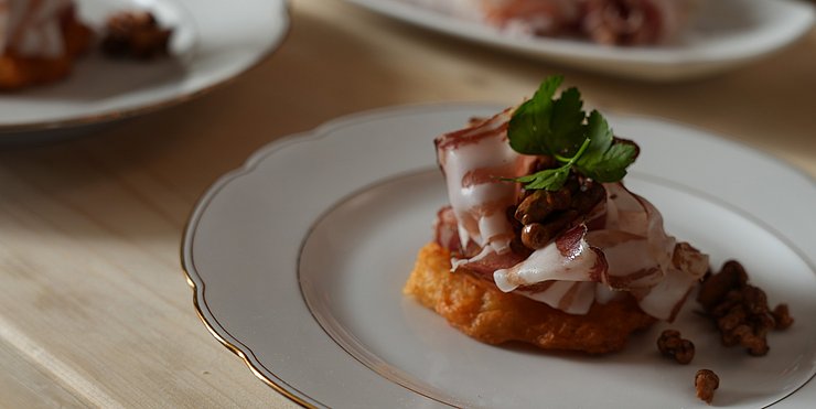Con una gita nella parte settentrionale del Trentino, si conclude in grande stile il viaggio culinario attraverso l’Euregio: Giulia Segna con il suo “tortèl e gropèl” propone una vera e propria dichiarazione d’amore gastronomica alla Val di Non. Le croccanti frittelle di patate – chiamate “tortèl” nel dialetto locale – sono semplici da preparare: basta sbucciare le patate, grattugiarle e poi friggerle in padella con un po’ d’olio per qualche minuto. Giulia le accompagna con finferli raccolti da lei stessa e con pancetta affumicata. A completare il piatto, il vino rosso Groppello – “gropèl” in dialetto. Questo vitigno, quasi dimenticato, è stato riscoperto di recente e cresce proprio accanto al paese, lungo le rive del torrente Novella. Una combinazione che unisce tradizione e territorio nel modo più autentico.